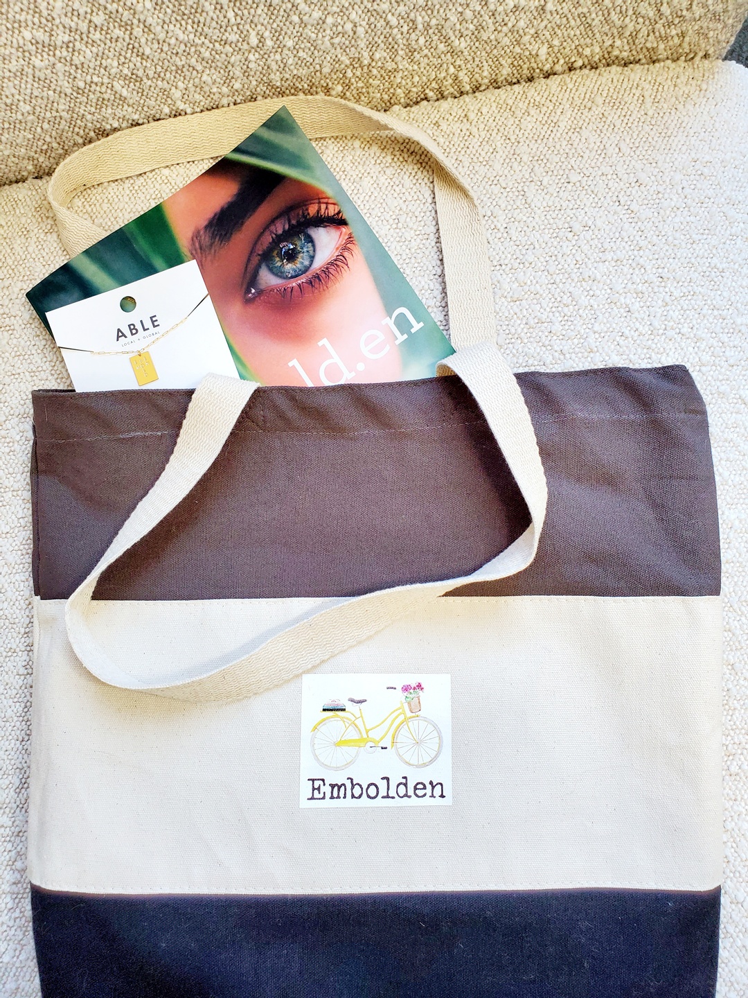 This combination includes: The Embolden book, The Addy bag, and our signature Embolden necklace by ABLE.